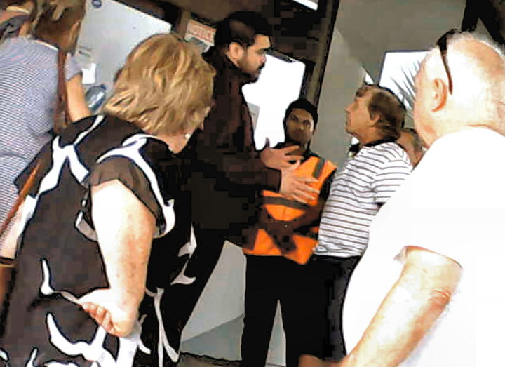President of Croatian Community Centre in Brisbane, Renata Sekulić looks happy while watching bouncers she hired to stop 50-100 members to vote at AGM, some of them marked with arrow didn't have any identification tags.